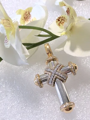 Der Anhänger besticht durch seine Kreuzform und die 117 eingeriebenen Brillanten mit einem Gesamtgewicht von 1,38 Karat, die in einer Fassung präzise eingebettet sind.